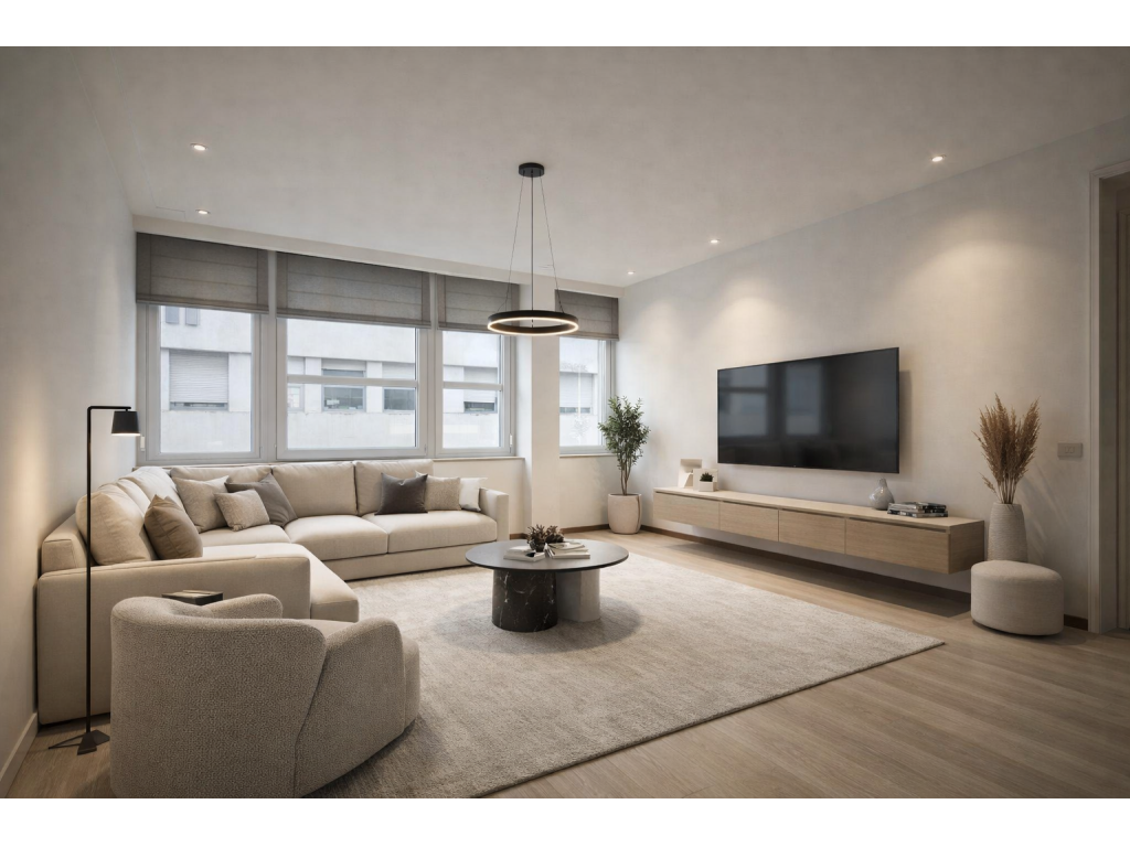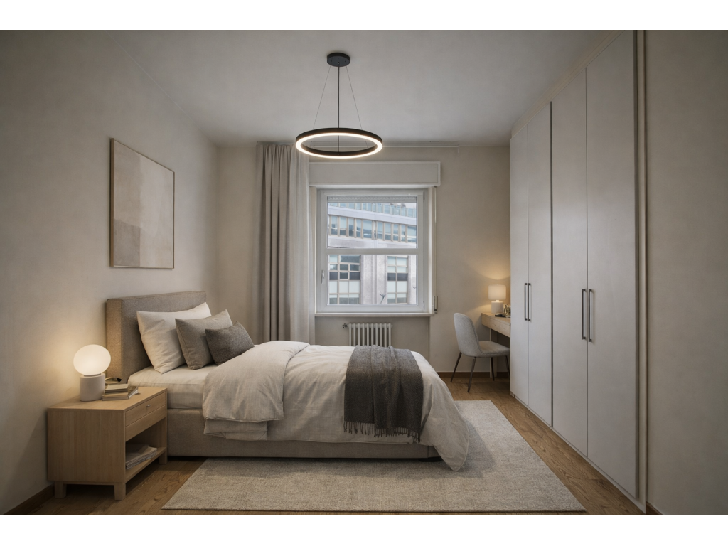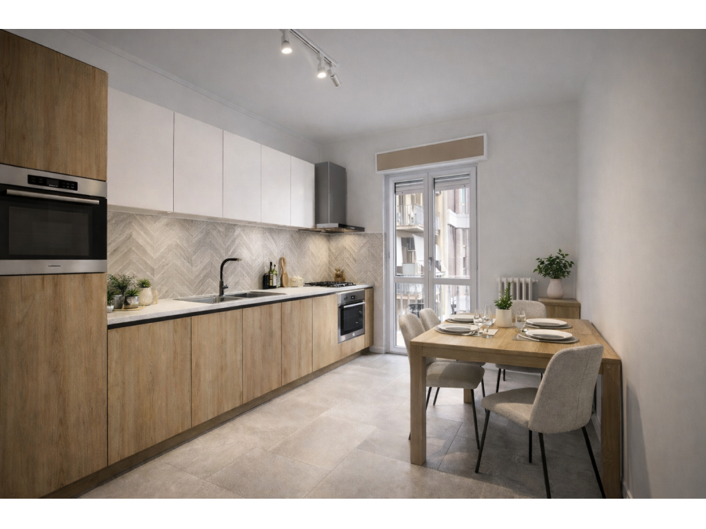 La zona giorno è composta da un soggiorno luminoso e da una cucina separata con affaccio sul balcone, un dettaglio prezioso e poco comune in questa zona centrale, ideale per chi desidera uno sfogo esterno anche vivendo in città.