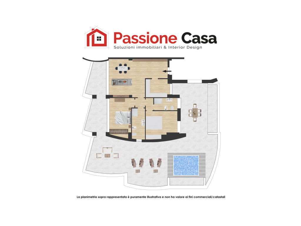 Tutti i principali ambienti affacciano direttamente sul terrazzo, creando un perfetto dialogo tra interno ed esterno, garantendo luminosità e ariosità.