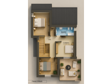 Salendo al primo piano si sviluppa la zona notte, composta da tre camere da letto: una matrimoniale padronale con accesso a un terrazzo riservato di oltre 15 mq, una seconda camera matrimoniale, una camera doppia, 1 bagno finestrato e 1 ripostiglio aggiuntivo.