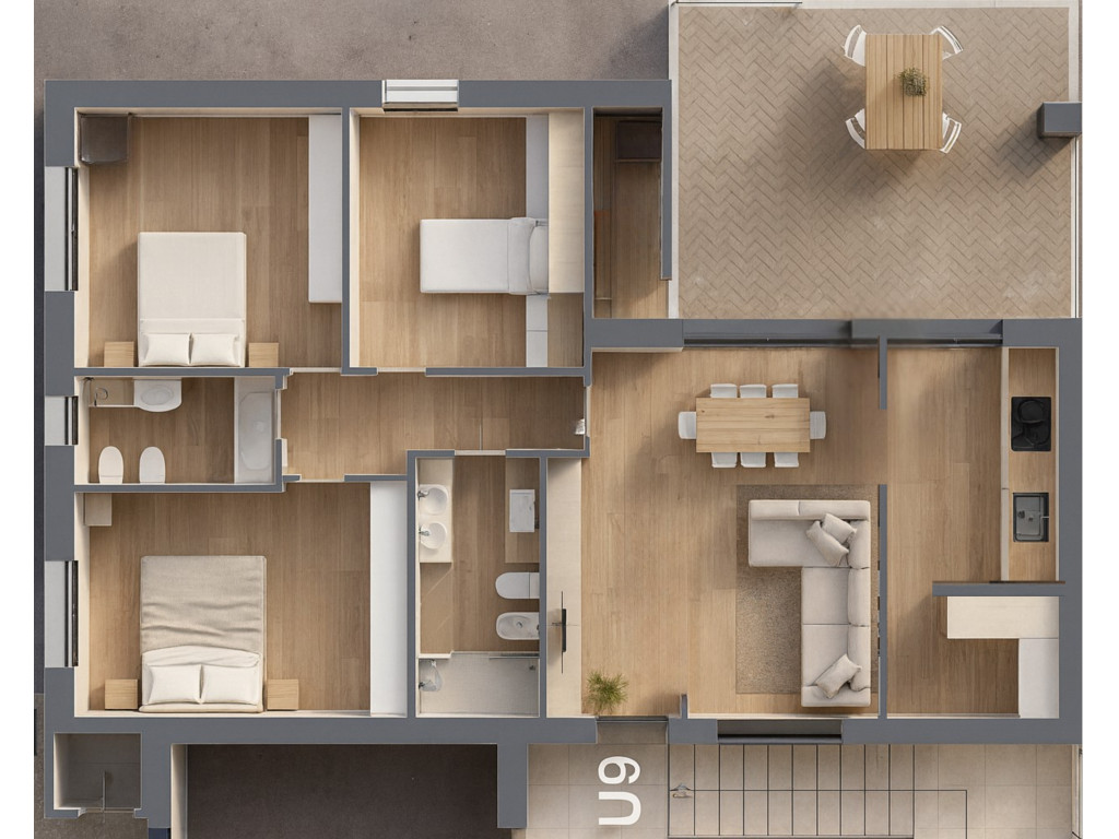 L’ingresso si apre su 1 soggiorno luminoso, connesso a 1 generoso terrazzo di 25 mq che regala aria, luce e spazio per vivere all’aperto in ogni stagione.