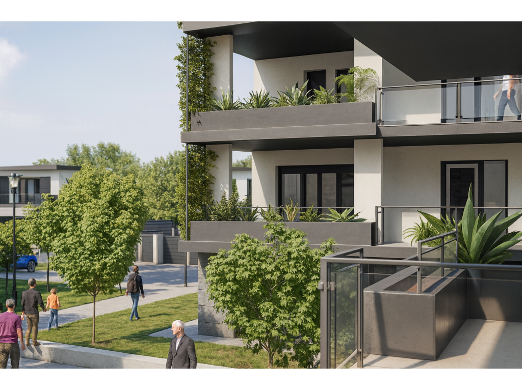 Gli spazi comuni sono curati, le finiture eleganti, il quartiere tranquillo e ben collegato, con ampio verde circostante, parcheggi, piste ciclabili e servizi di prossimità.
