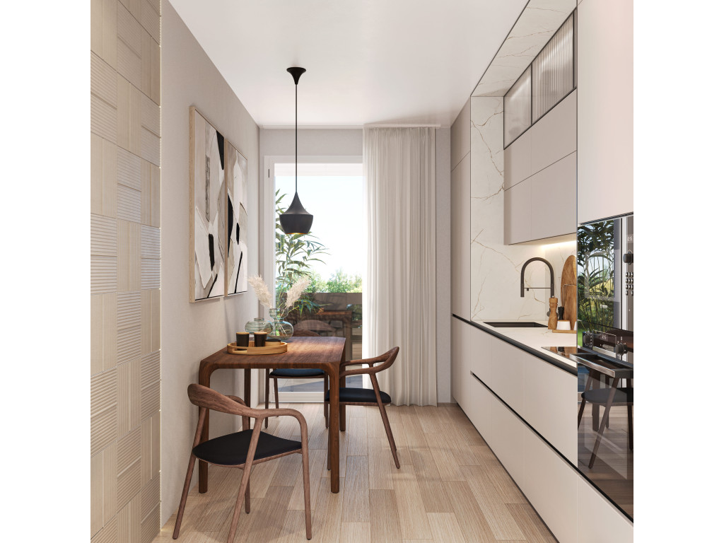 L’ingresso si apre su un elegante soggiorno che affaccia direttamente sulla loggia coperta di 20 mq, perfetta per godersi momenti di relax all’aria aperta. La cucina abitabile è separata e gode di un balcone privato di 10 mq, rendendo la zona giorno ariosa e funzionale.